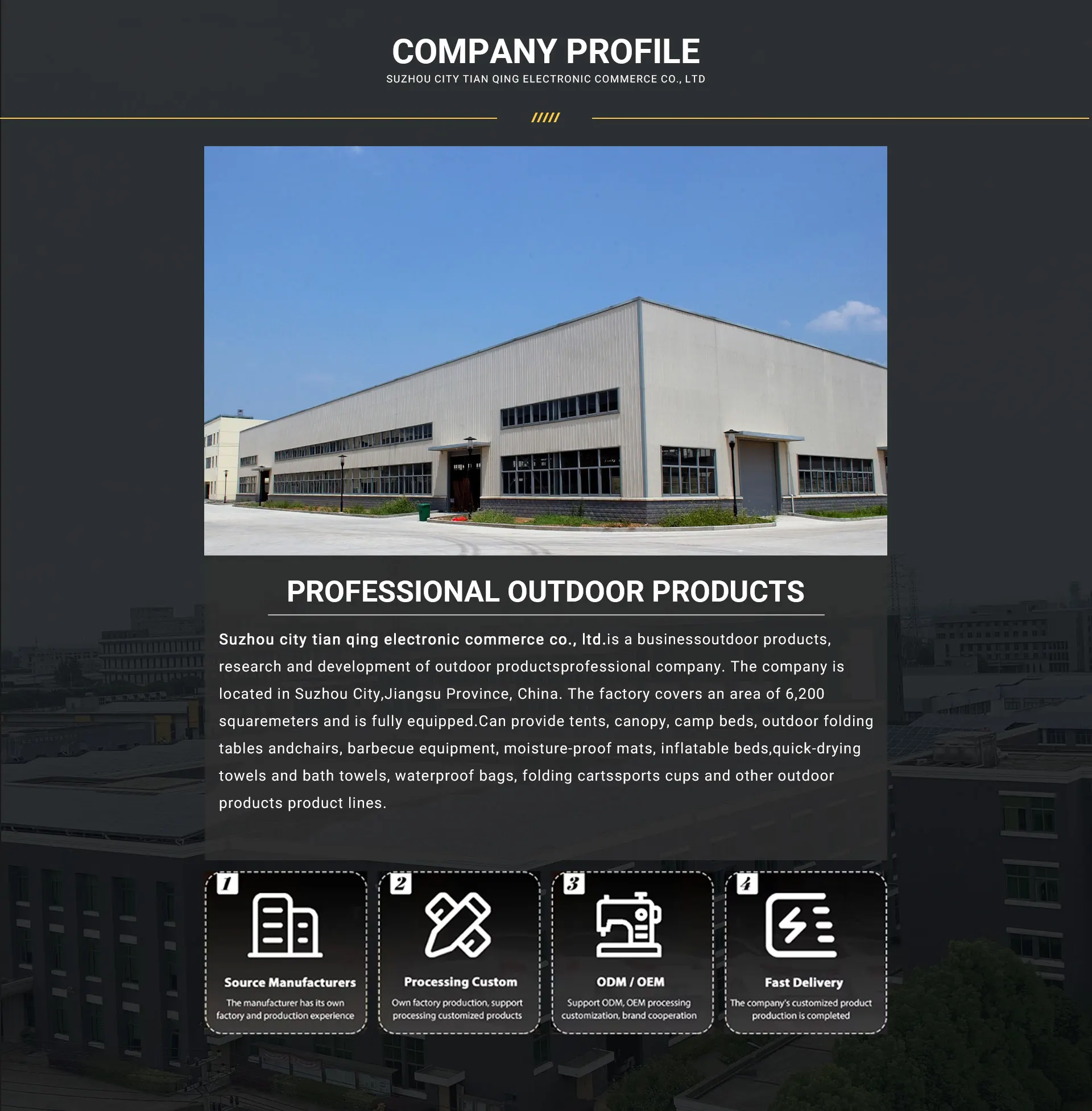 Belangrijkste producten:Loopbandmachine, opklapbed voor kamperen, opvouwbare campingtafel, barbecuegrillrekken, kampeertenten